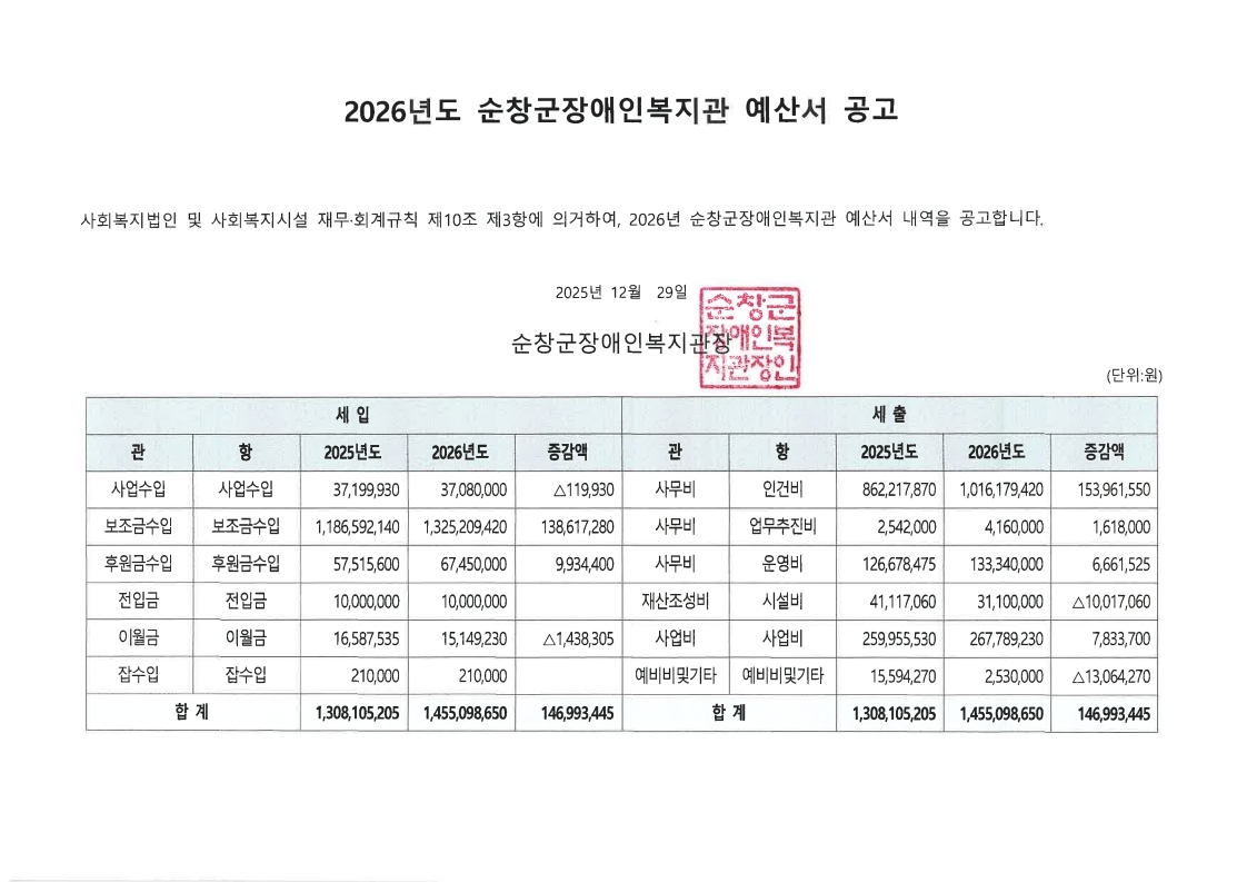 2026년도 순창군장애인복지관 예산서 공고