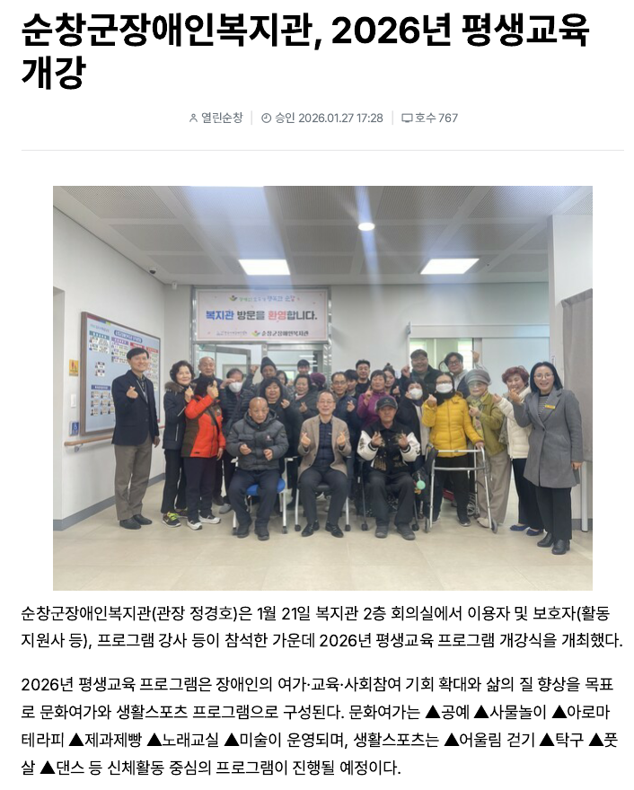 2026년 순창군장애인복지관 평생교육 개강(열린순창) 최고관리자 0 130 01.28 17:03 https://www.opsc.kr/news/articleView.html?idxno=47790 + 50 출처: 열린순창(https://www.opsc.kr/news/articleView.html?idxno=47790)