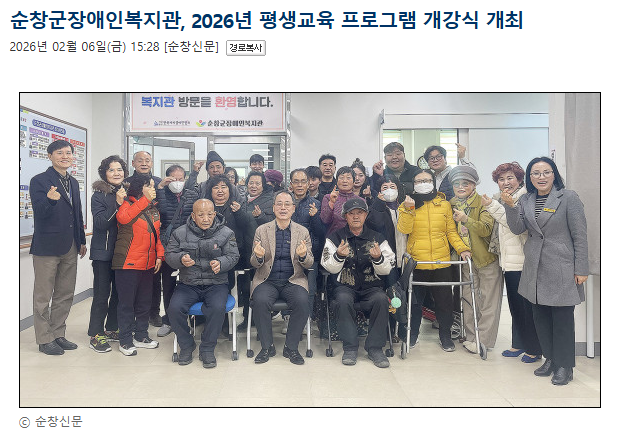 순창군장애인복지관, 2026년 평생교육 프로그램 개강식 개최 최고관리자 0 41 02.08 17:34 http://www.scnp.kr/default/index_view_page.php?board_data=aWR4JTNEMzc2… + 40 순창신문(www.scnp.kr/default/index.php)
