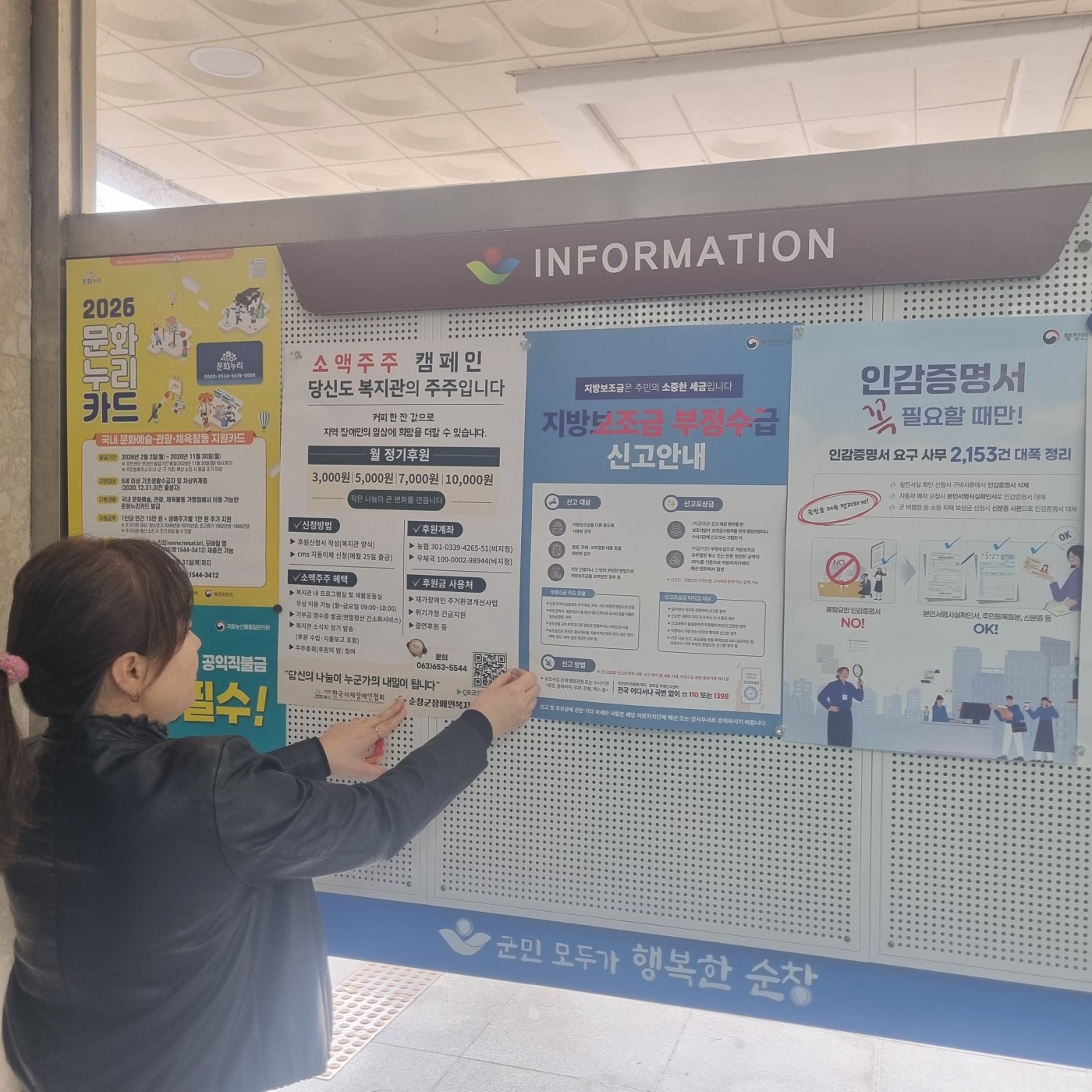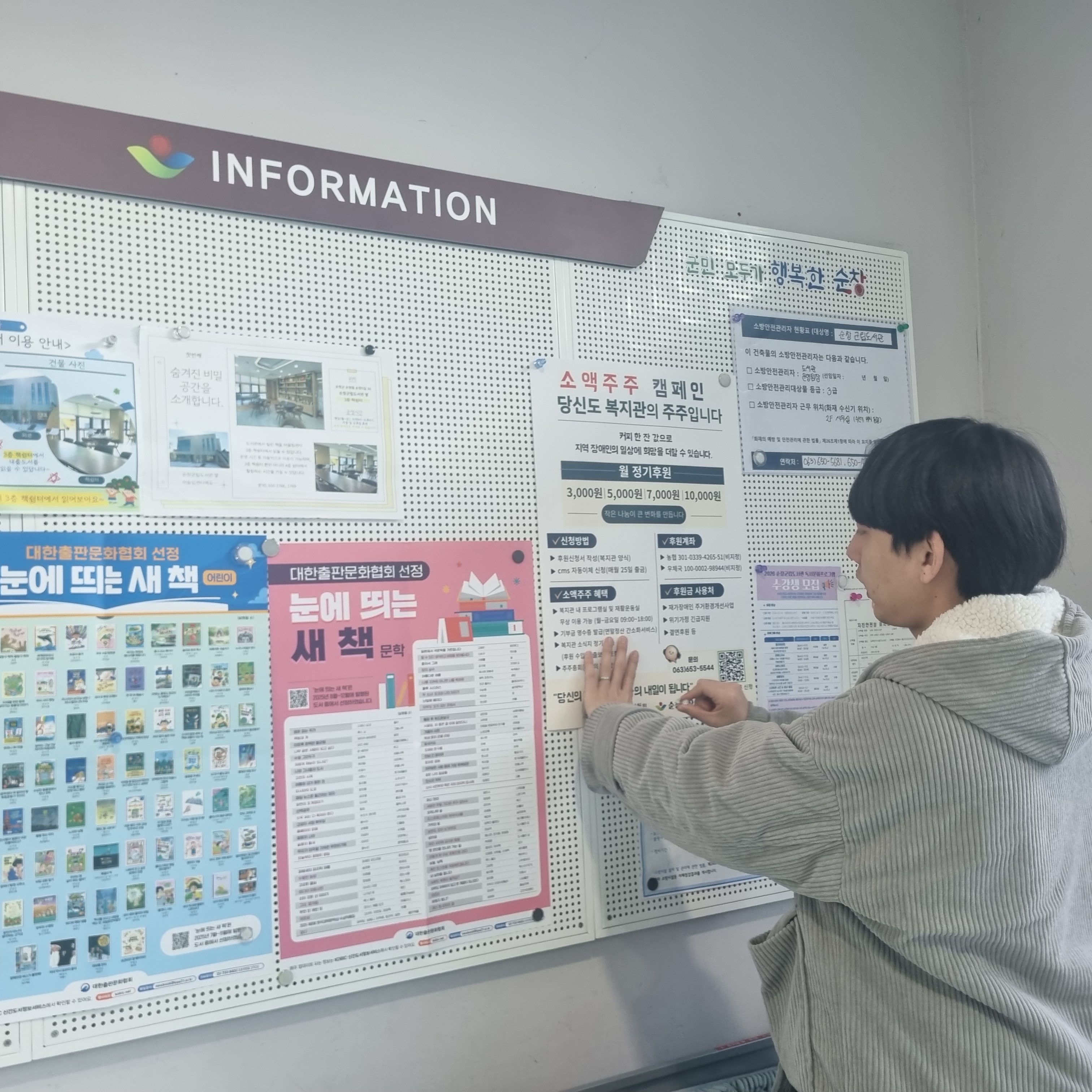 순창군장애인복지관에서는 지역사회 나눔 문화 확산을 위해 소액주주 캠페인 후원 홍보 포스터를 제작하여 순창군청, 순창읍 카페와 약국 그리고 각 읍·면 행정복지센터에 부착하며 후원 참여를 안내하고 있습니다.